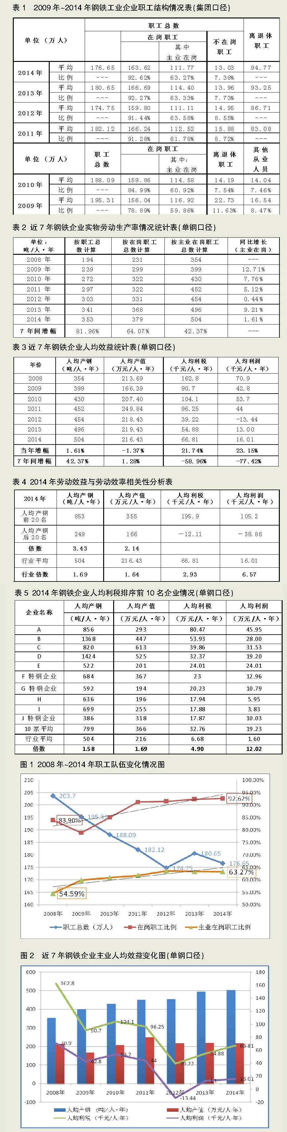 截至2015年9月底,鋼協(xié)共收到124家會員單位報來的《2014年鋼鐵工業(yè)企業(yè)勞動人事統(tǒng)計報表》。其中,以集團口徑統(tǒng)計,實際納入統(tǒng)計范圍的鋼鐵集團企業(yè)為75家;以單鋼口徑統(tǒng)計,實際納入統(tǒng)計范圍的鋼鐵企業(yè)共計107家。以單鋼口徑計算,上述107家鋼鐵企業(yè)2014年共生產(chǎn)粗鋼5.64億噸,占全國粗鋼產(chǎn)量8.23億噸(國家統(tǒng)計局《2014年國民經(jīng)濟和社會發(fā)展統(tǒng)計公報》)的68.25%。